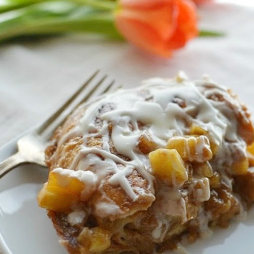 Croissants layered with caramelized apples and an apple butter flavored custard is baked and then drizzled with a powdered sugar glaze fresh from the oven. Will need to be baked in your oven for the freshest flavors. Amazing! 9×13 pan. Serves 6-8.