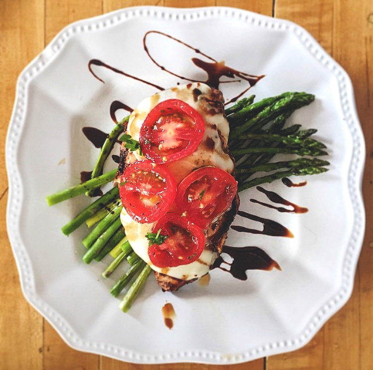 This chicken is the perfect balance of sweet and savory. Marinated, grilled, topped with fresh mozzarella, fresh basil and a fresh slice of tomato and then glazed with a brown sugar balsamic reduction. Served with roasted asparagus.