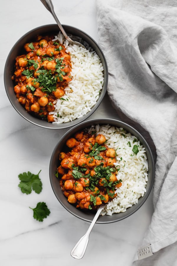 This restaurant style chana masala is a classic Indian chickpea curry in a fragrant masala sauce served with basmati rice. 100% plant based. $9
