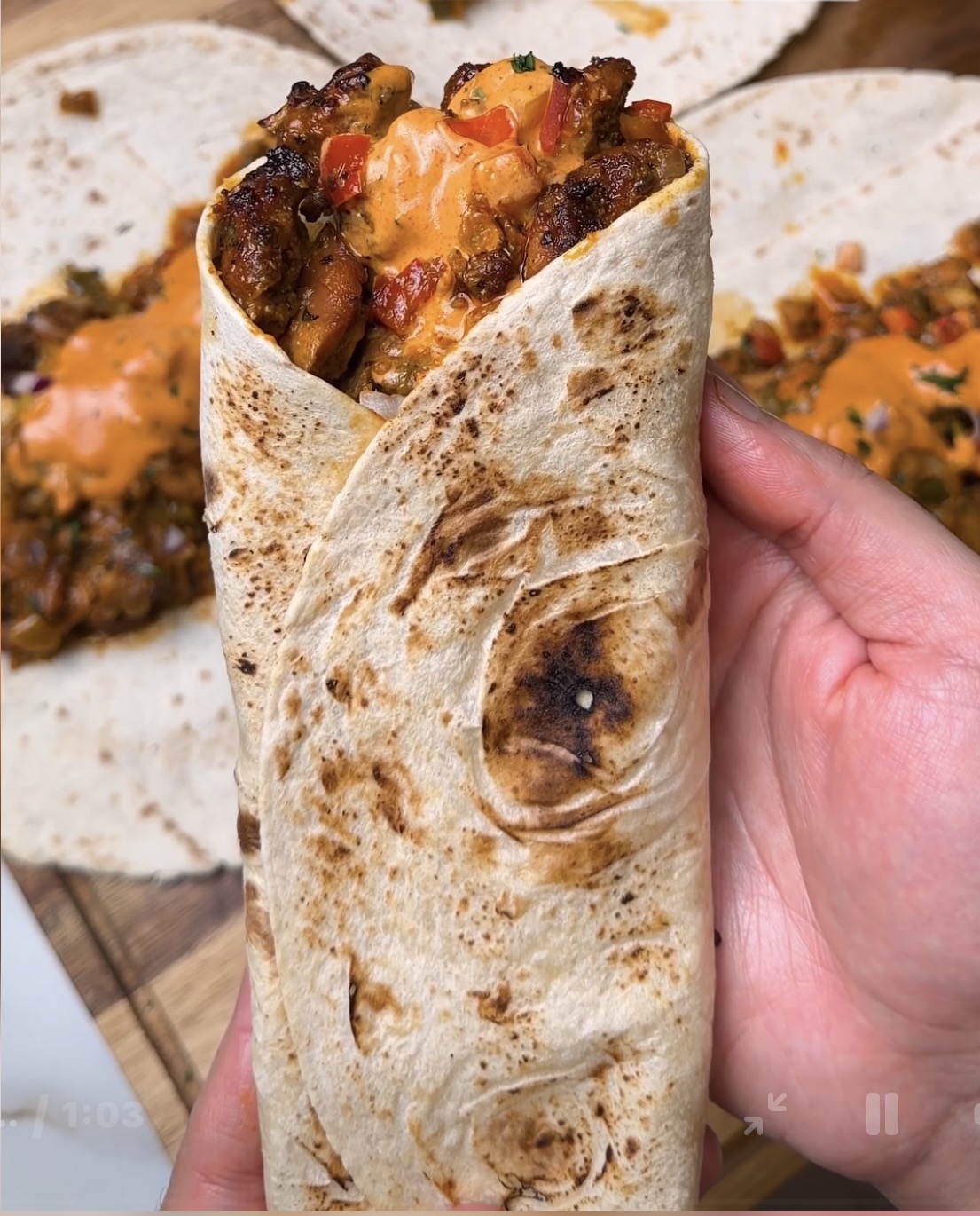 2 tortillas filled with fajita chicken breast, onions, bell peppers, and cheddar and mozzarella. 394 calories, 27g carbs, 43g protein per wrap