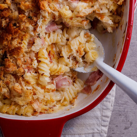 Chicken, pasta and ham smothered in a creamy, dreamy sauce and topped with panko bread crumbs. Needs to bake in your oven for 30 minutes.