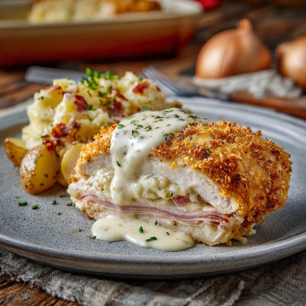NEW RECIPE! Crispy Panko breaded chicken breast stuffed with Virginia ham and Swiss cheese and topped with a creamy Swiss cheese sauce served with a twice baked potato casserole. 725 cal, 42g protein, 60g carbs per serving, 2 servings per container. freezer friendly