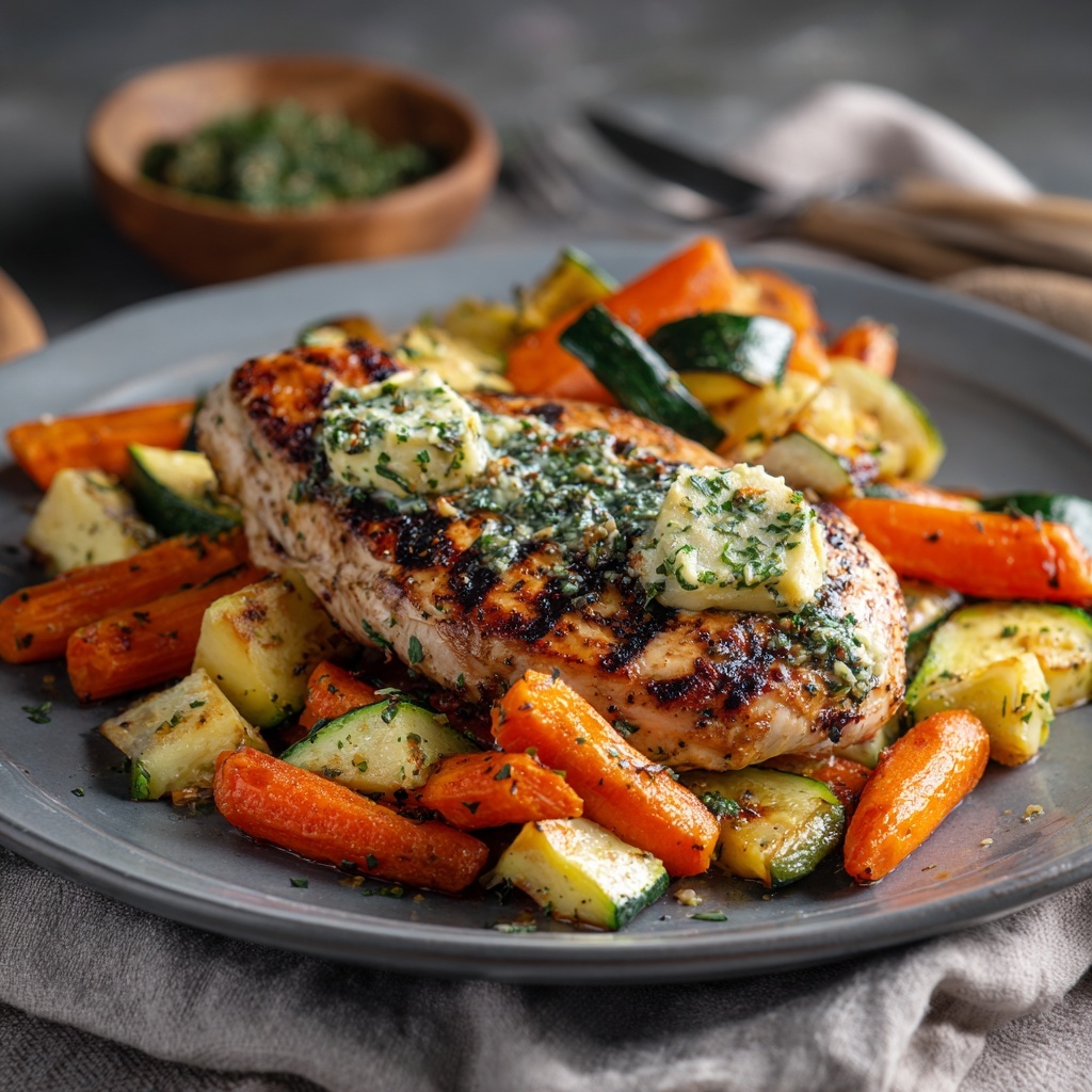 Grilled Chicken breast with an herb compound butter with roasted carrots and zucchini. alpha-gal friendly sub butter for olive oil, gluten free, freezer friendly