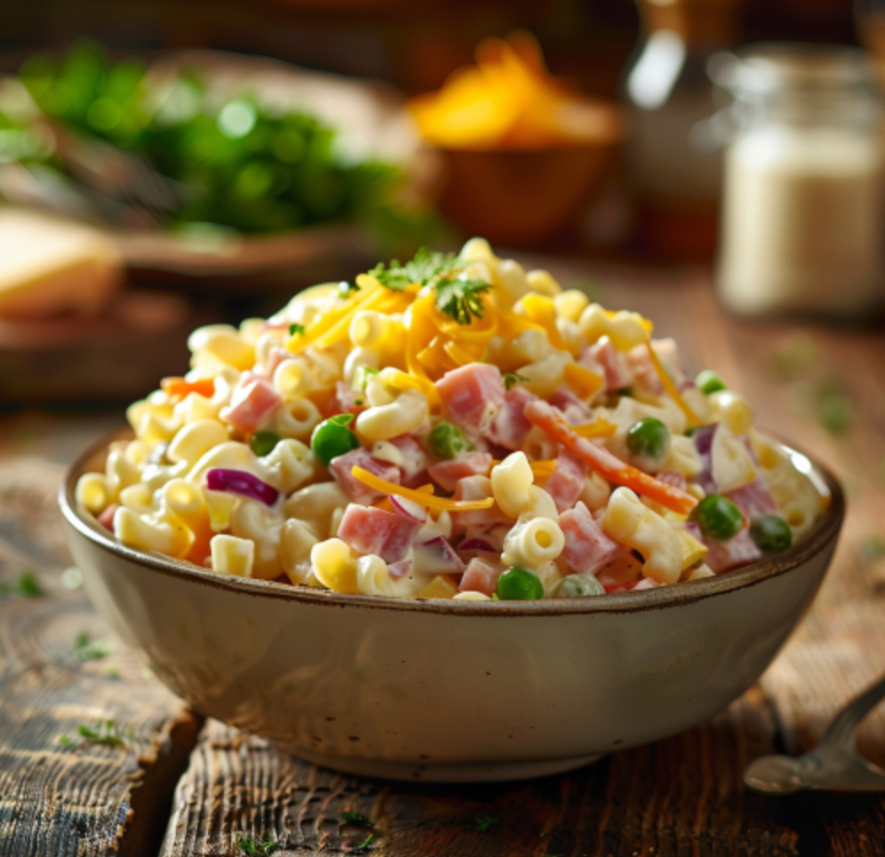 Perfect for summer! Macaroni, ham, carrots, celery, red onion, peas, and cheddar cheese all in a house made ranch sauce. Delicious! $14/Quart
