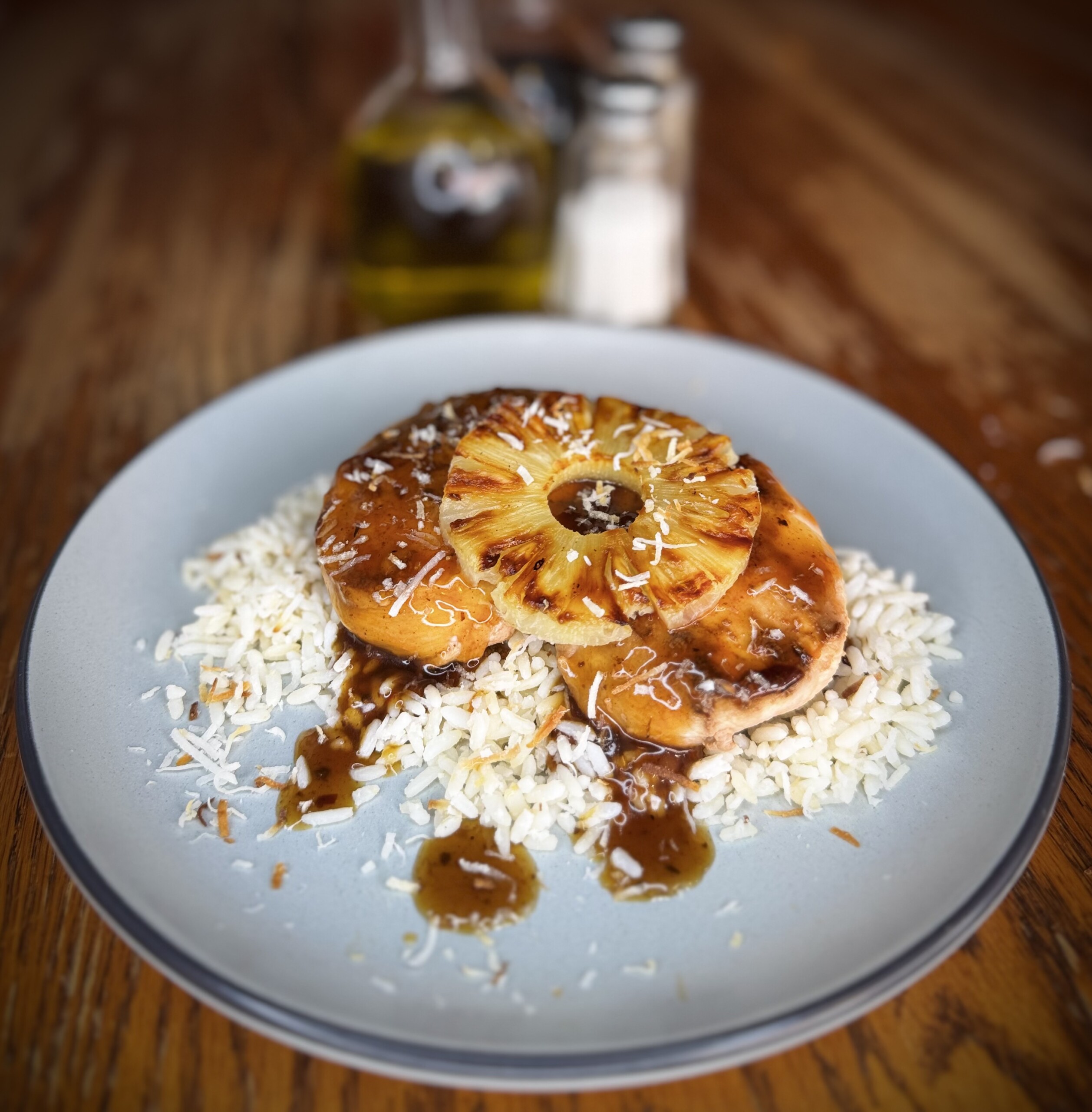 A taste of Hawaii! Sweet and savory chicken breast marinated, grilled with grilled pineapple and sweet glaze served over coconut almond rice pilaf. Alpha Gal friendly, freezer friendly, Approx. 600 cal, 65g carb, 60g protein per serving