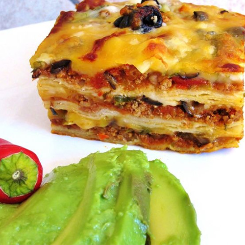 Sort of a “Mexican Lasagna”, this one is made up of layers of seasoned ground beef, colby cheese, salsa, refried beans and flour tortillas. Ready to pop into your oven to bake for about 30 minutes.