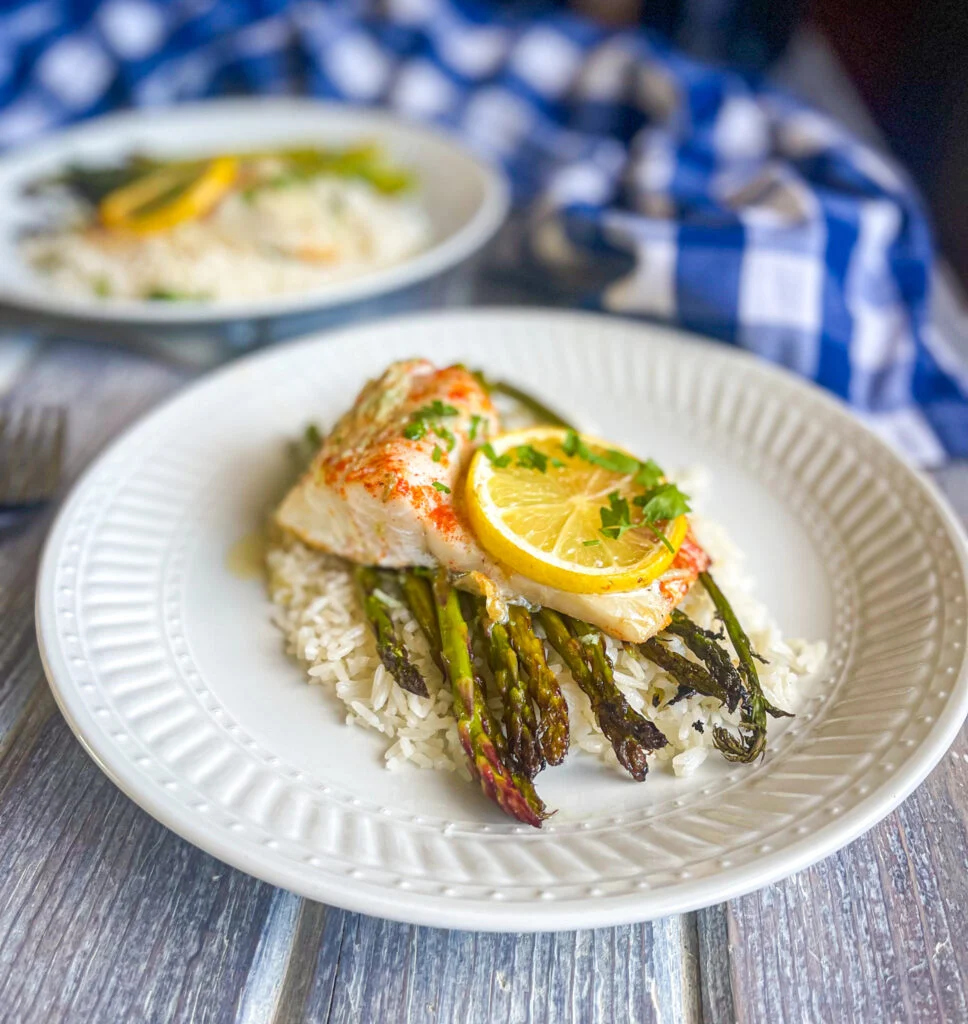 Baked Cod with lemon and butter served with zesty rice and asparagus topped with almond slices. So fresh!