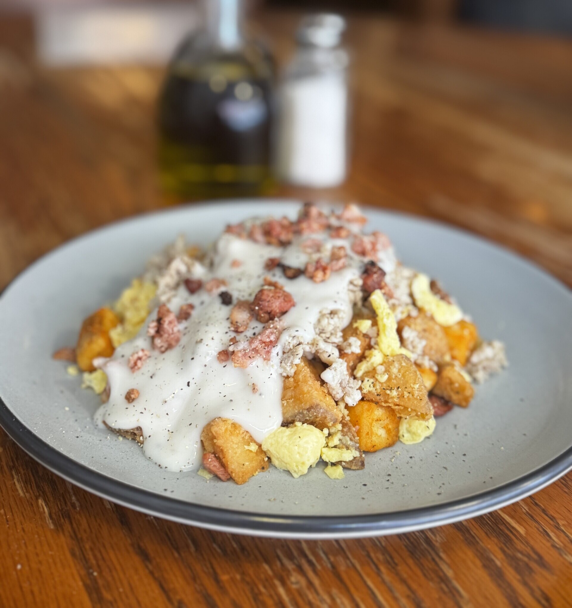 Who loves pork? We do! This high protein breakfast slinger is chock full of sausage, bacon, potatoes, scrambled eggs all topped with a sausage gravy.