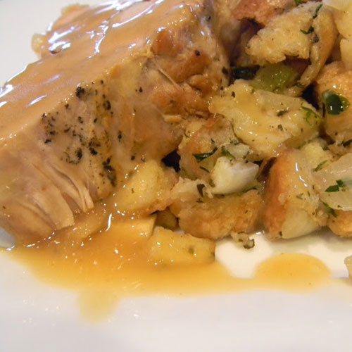 Tender medallions of roasted pork topped with herbed gravy and served alongside our famous sausage and apple stuffing and mashed potatoes.