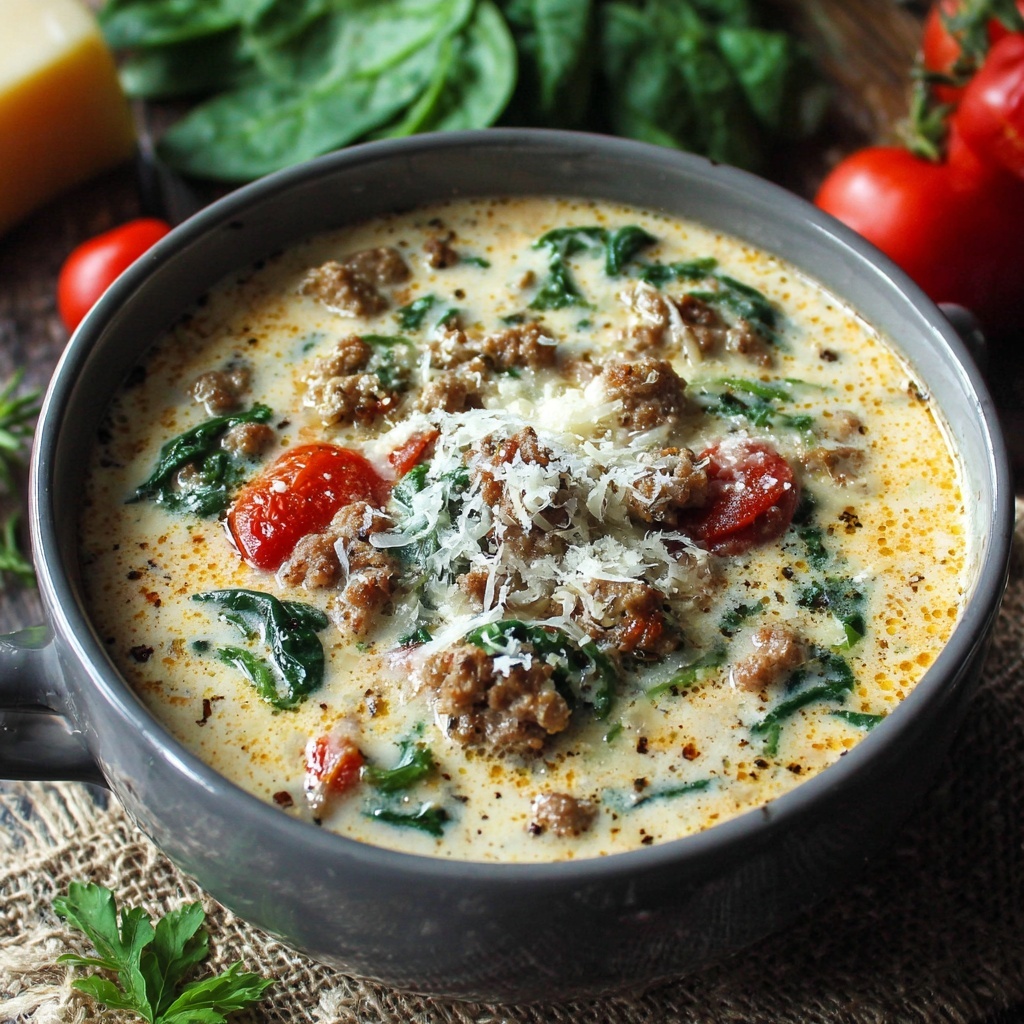 Mild Italian Sausage with Tomatoes, onions, spinach, Parmesan, and cream, all stewed together to make this hearty, meaty, creamy goodness! freezer friendly, gluten free $15/quart