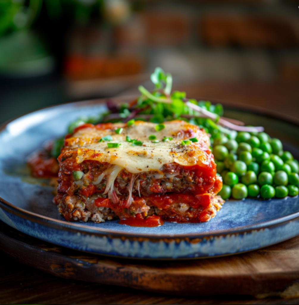 This Italian meatloaf is absolutely wonderful!  Moist meatloaf flavored with Italian herbs and spices, topped and layered with prosciutto and provolone cheese and covered with marinara sauce with a side of buttered peas. freezer friendly