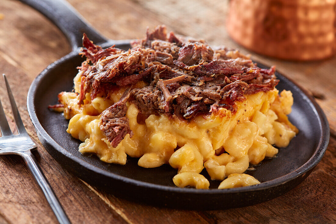 A creamy three cheese mac and cheese topped with slow smoked brisket in a sweet and tangy BBQ sauce.