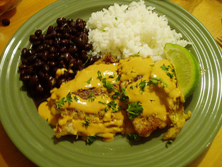 Baked Tilapia fillets with a Serrano cream sauce served on the side over a bed of cilantro-lime rice and seasoned black beans.